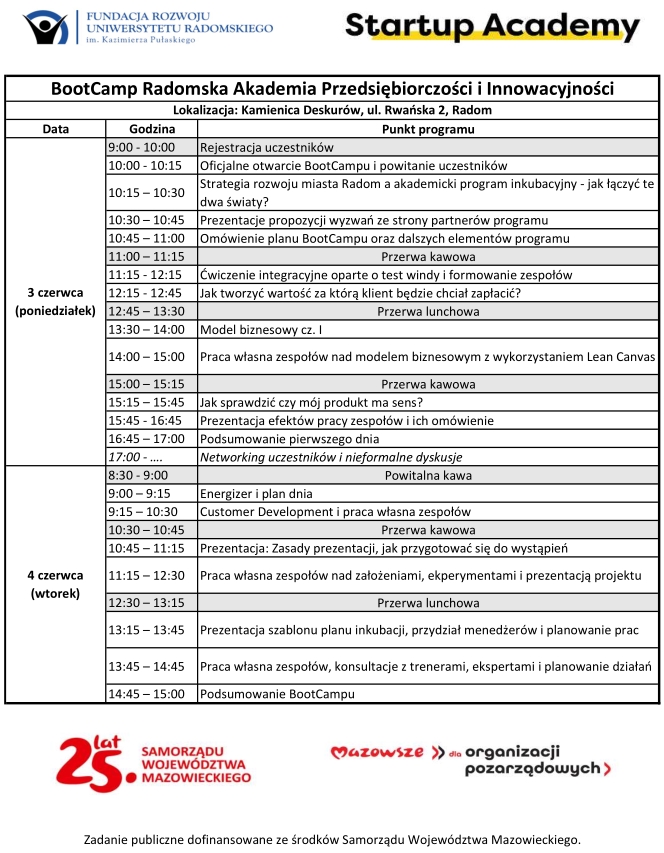 HarmonogramBootCamp Radom 3-4 czerwca dla uczestników -> pobierz w PDF